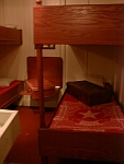 A plain doorway herded us down a white hallway with clean white pipes running along the ceiling. The lights on either side and the backup in the hall was eerily reminiscent of the confused crowds awakened in the night and instructed to get their lifebelts on. To our right was a third class room with two sets of bunk beds all made up with red blankets and luggage strewn on them. Between the beds, on the wall were a mirror and a foldout shelf.