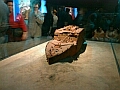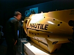 The second ramp had part of a bench, a water heater from the Captain's quarters, an ornate window, and suspended above was a huge yellow submersible. Walking under its belly, we could see lots of the detail in its design. We were crossing the gap of 74 years to the discovery of the wreck. Here was a room much like the very first one that was dedicated to the building of Titanic. It was abuzz with the din of another television telling the story of the wreck, the humming of lighted aquariums with submerged pieces inside, and people talking and pointing, after having been respectfully quiet for the last few passageways. The center of the room mirrored the scale model only this one had the bow section of the wreck. I circled it, taking pictures, noticing just how beautiful it still was.