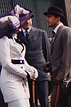 - Young Rose dressed in a stunning white and purple outfit, with an enormous feathered hat -- the large hat is symbolic of the oppression Rose feels, as is the walk up the elevated boarding bridge a few minutes later.