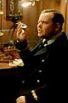 Wireless Operater CYRIL EVANS pulls his earphone off his ear as the Titanic's spark deafens him. he translates the message for THIRD OFFICER GROVES.