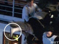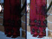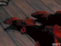 Rose's attempt at suicide places her perilously over the stern railing. Was Kate Winslet in stocking feet as she stood on the set (which really had her only 12 feet off the ground)? Would they have traded out her slippery shoes during the scene so she wouldn't fall? Even after going through the scene frame-by-frame, I can't decide. This one I will leave up to you. Notice in Exhibit C how her feet appear darker than her bright red shoes from Exhibit D.
