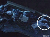 Exhibit C is split into the original lighting conditions from the movie, on the left, and my adjusting the lighting via computer to try and reveal more detail, on the right. Of course Exhibit D has her shoes in more light, so perhaps Exhibit C shows the same shoes in less light. The claim says these are her stocking feet because there is an outline of her toes, but those could very well be the ledge obscuring parts of the shoes.